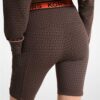 Este pantalón de ciclista con cinta de logotipos exhibe un diseño inspirado en la ropa deportiva de los años 90. Se ha confeccionado en nailon elástico parcialmente reciclado con una favorecedora cintura alta que aumenta la sujeción. Combínalo con un jersey corto con estampado MK a juego para crear un look impactante.